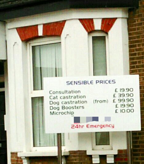 Per una consultazione, 19,90 sterline. Castrazione di un gatto: 39,90 sterline. Castrazione di un cane: a partire da 99,90 sterline.'Dog boosters": 19,90 sterline. E per l'installazione del microchip 10 sterline.