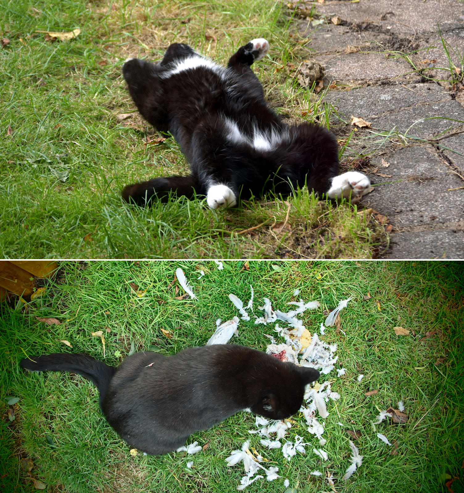 09/12/2020 | Claudio_VL | 0 commentiIl mio gatto non è mio. E' i gatto dei miei vicini, ma come sempre con i felini domestici, e' lui a decidere dove passare il tempo, per cui durante il giorno trascorre molte ore nel mio giardino, seguendomi quasi come un cane. Ma è un gatto, e mantiene il suo istinto per la caccia. Può passare un’ora a rotolarsi e riposare sull’erba, poi dico di colpo scatta in piedi e dopo pochi minuti ritorna al suo posto, ma con un piccione moto da spennare. Cosi':